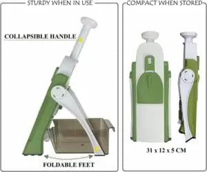 Easy to Clean: The Slicer compact design folds up for easy storage. The built-in brush eliminates the dirt on the blade, and the food collection container keeps the table clean.